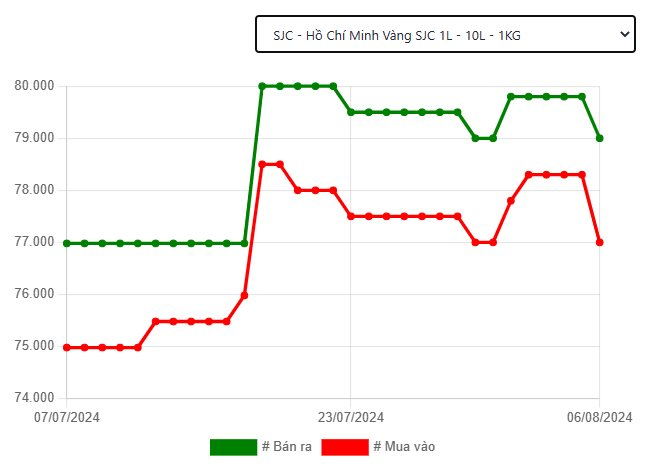 Mở phiên 6/8, Công ty Vàng bạc đá quý Sài Gòn (SJC) công bố giảm giá vàng miếng SJC 1,3 triệu đồng/lượng ở chiều mua vào và giảm 800 nghìn đồng/lượng chiều bán ra so với chốt phiên hôm qua, niêm yết ở mức giá 77 - 79 triệu đồng/lượng (mua vào - bán ra). Chênh lệch giá mua - bán vàng SJC tăng từ 1,5 triệu lên 2 triệu đồng/lượng khiến nhà đầu tư đối diện nguy cơ thua lỗ.