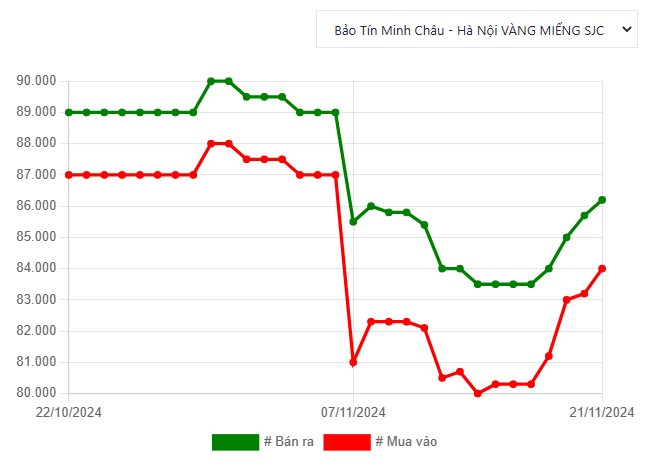 Công ty Bảo Tín Minh Châu tăng giá vàng miếng SJC thêm 800 nghìn đồng/lượng ở chiều mua và 500 nghìn đồng/lượng ở chiều bán. Sau điều chỉnh, mặt hàng này niêm yết ở mức 84, 86,2 triệu đồng/lượng.