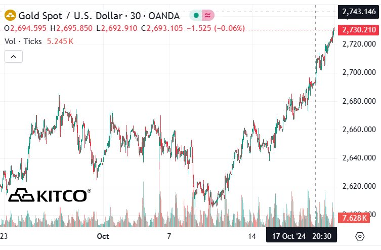 Trên thị trường vàng quốc tế, giá vàng thế giới tiếp tục tăng nóng thêm 33,2 USD/ounce lên vùng 2.730,3 USD/ounce. Nếu quy đổi theo tỷ giá Vietcombank, chưa bao gồm thuế, phí, giá vàng thế giới hiện có giá trị 83,5 triệu đồng/lượng, thấp hơn giá vàng trong nước khoảng 4,5 triệu đồng/lượng.