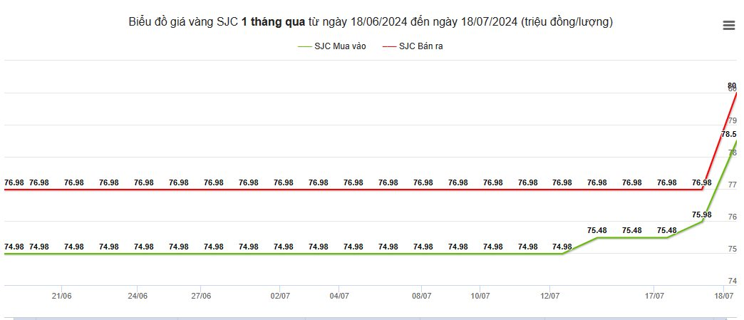 Theo nhịp điều chỉnh chung của giá vàng SJC, Công ty TNHH MTV Vàng bạc Đá quý Sài Gòn (SJC) cũng ghi nhận tăng giá vàng miếng SJC 2,5 triệu đồng chiều mua vào và 3,02 triệu đồng ở chiều bán ra, niêm yết giá vàng miếng mua vào – bán ra lần lượt ở mức 78,5 – 80 triệu đồng/lượng.